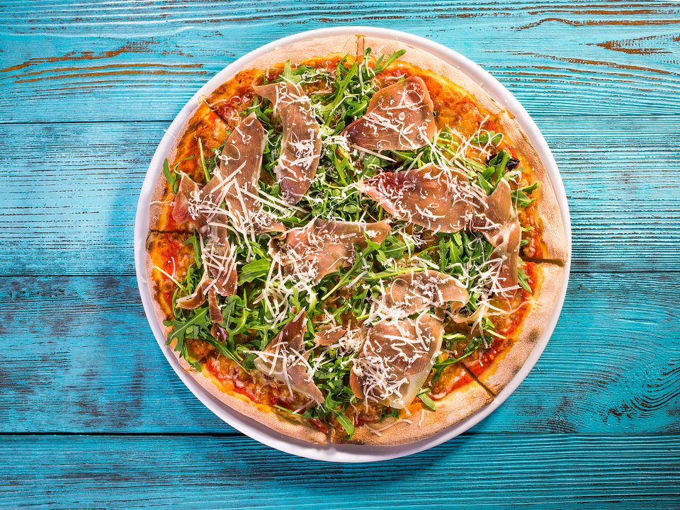 sauce, mozzarella cheese, parmen ham, parmesan cheese, arugula