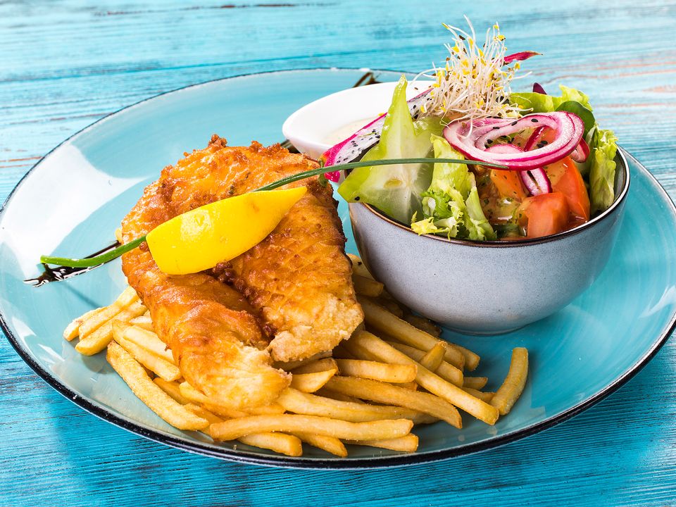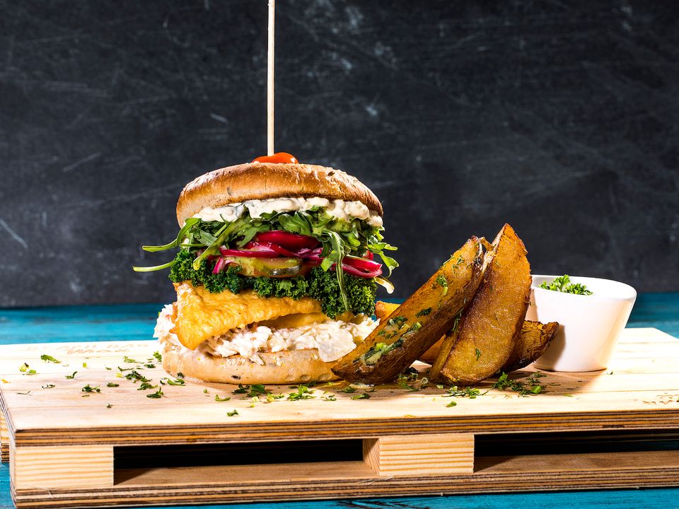 crunchy cod fillet, tomato, coleslaw, pickled onion, chips
