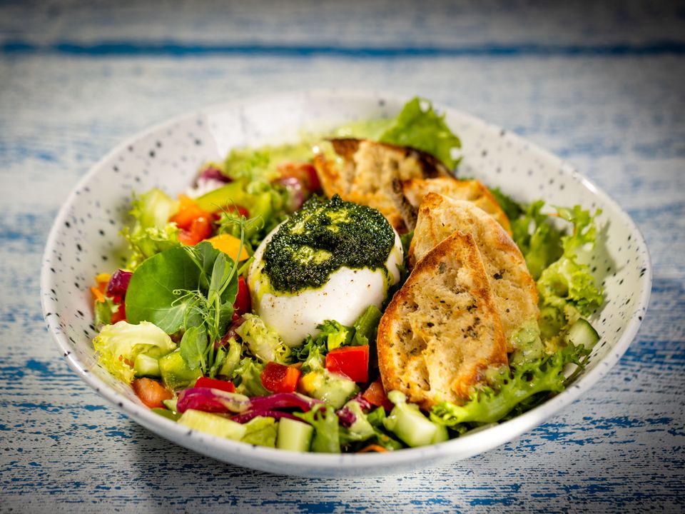 fresh vegetables, bouquet of salat, parmesan cheese, vinaigrette, crispy bread