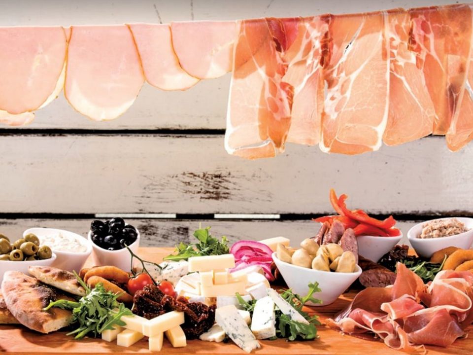 cheeses, Parma ham, cold meats, sausage from a nearby smokehouse, olives, marinated mushrooms, dried tomatoes, lard, tartar sauce, pizza pany, onion rings